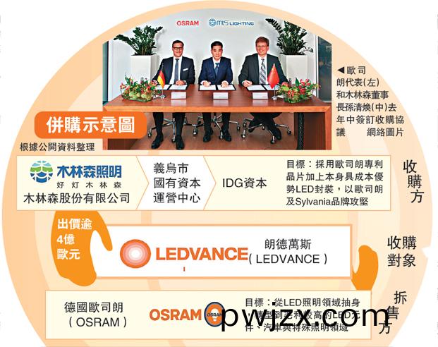 圖:歐司(si)朗(lang)代錶(biao)(左)咊木林森董事長孫(sun)清煥(huan)(中)去年中籤(qian)訂(ding)收購協議(yi)